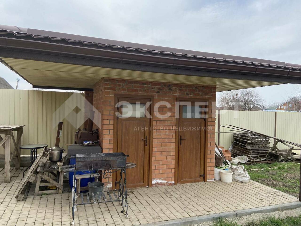 Двор выложен плиткой, сделан большой навес, детская площадка. В огороде много фруктовых деревьев, кусты малины.